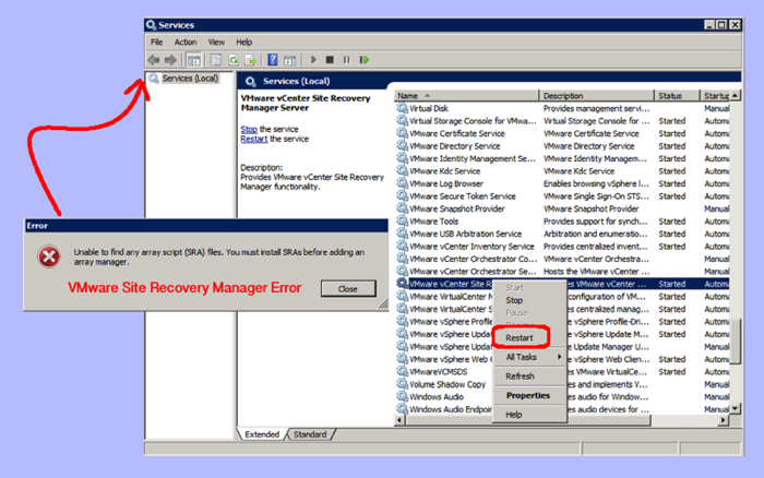 Last week, I installed VMware 5.5 Update 2e (which worked fine) and then I installed Site Recovery Manager (SRM) which seemingly went fine. As a third step, I install Site Recovery Array (SRA) and then ran the vSphere client and installed the Site Recovery Plugin. Note that in version 5.5, SRM is not available via the web client, so you must install the vSphere client to access the SRM admin GUI. Anyway, when I went to add an array manager within SRM, I received the error “Unable to find any script (SRA) files. You must install SRAs before adding an array manager”. I scratch my head, I had already installed the SRA software! What was wrong?